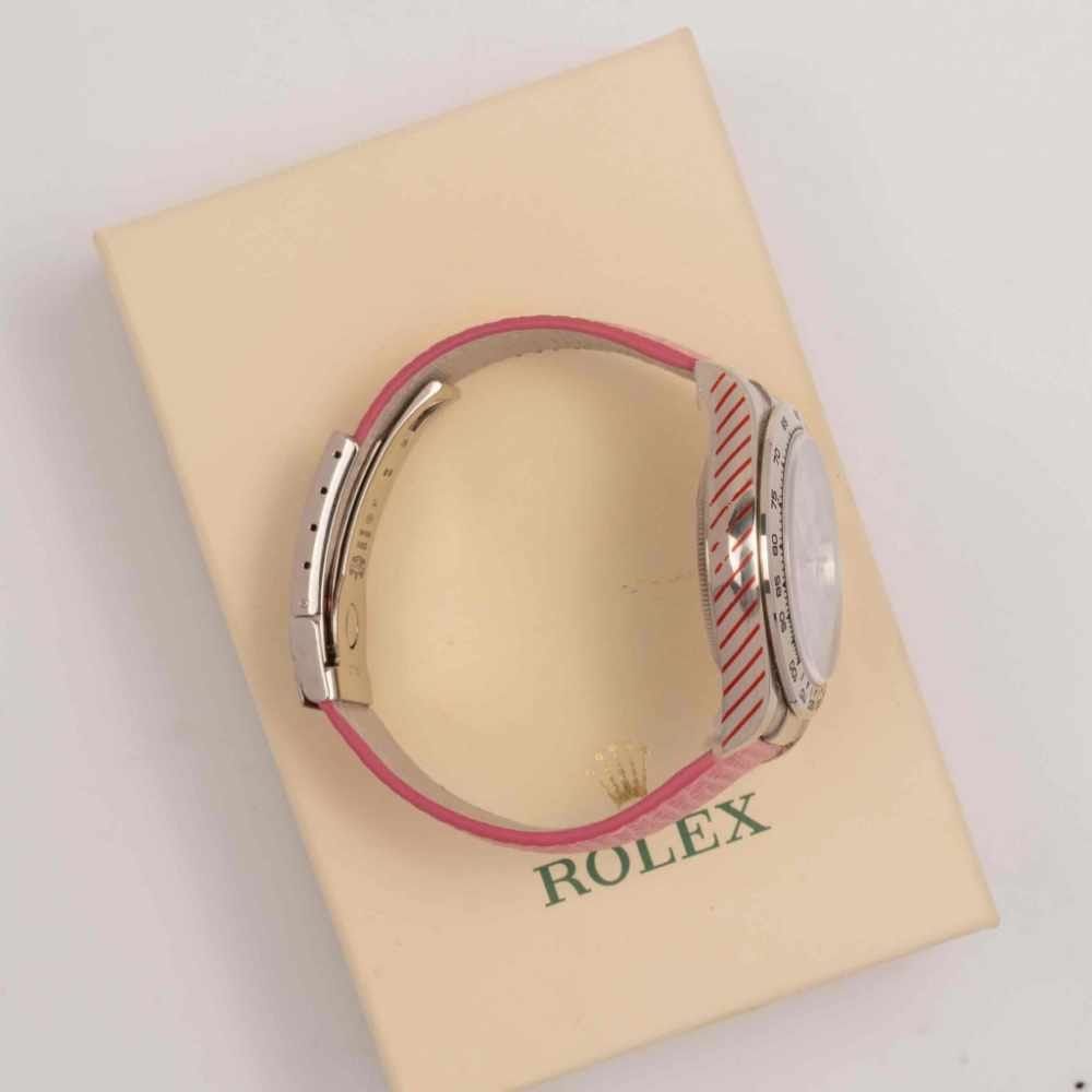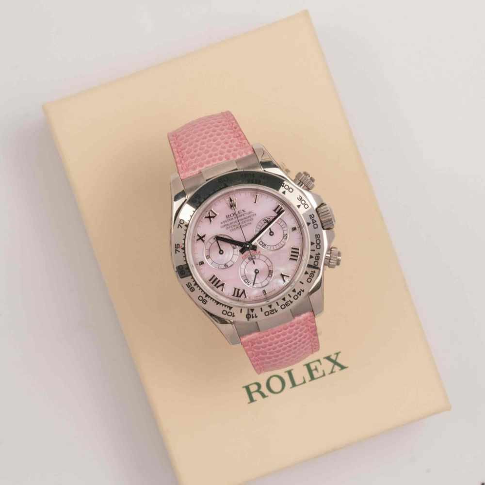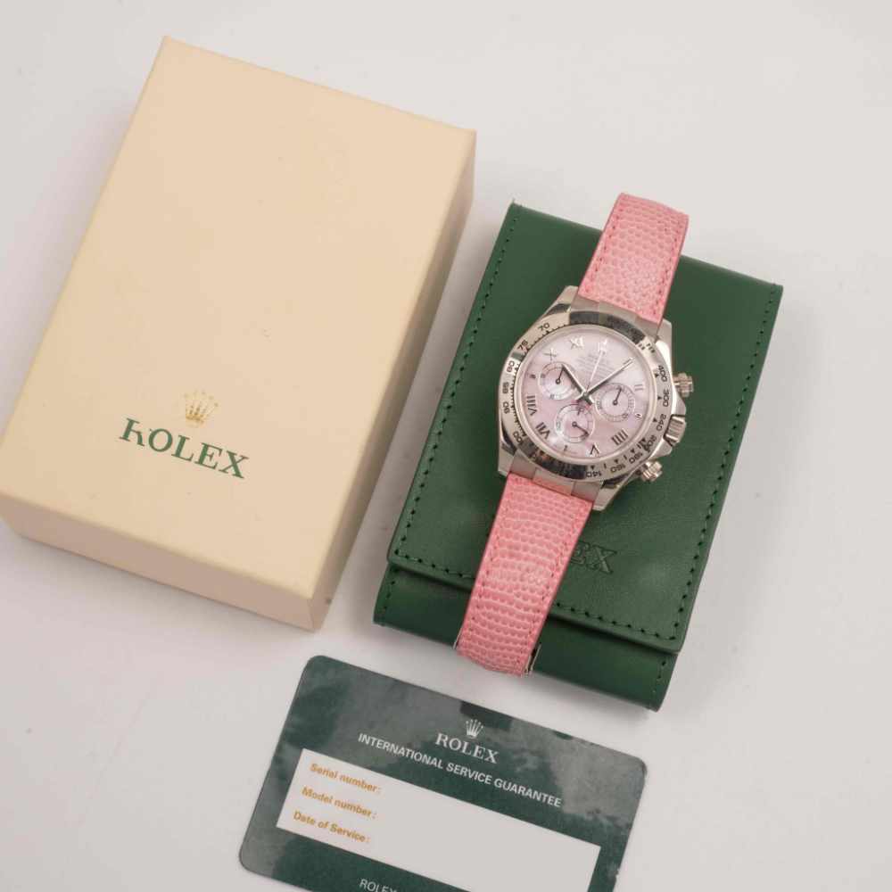 Chic Daytona with distinctive pink dial. A rare, playful twist on an iconic chronograph.