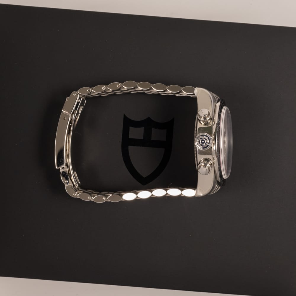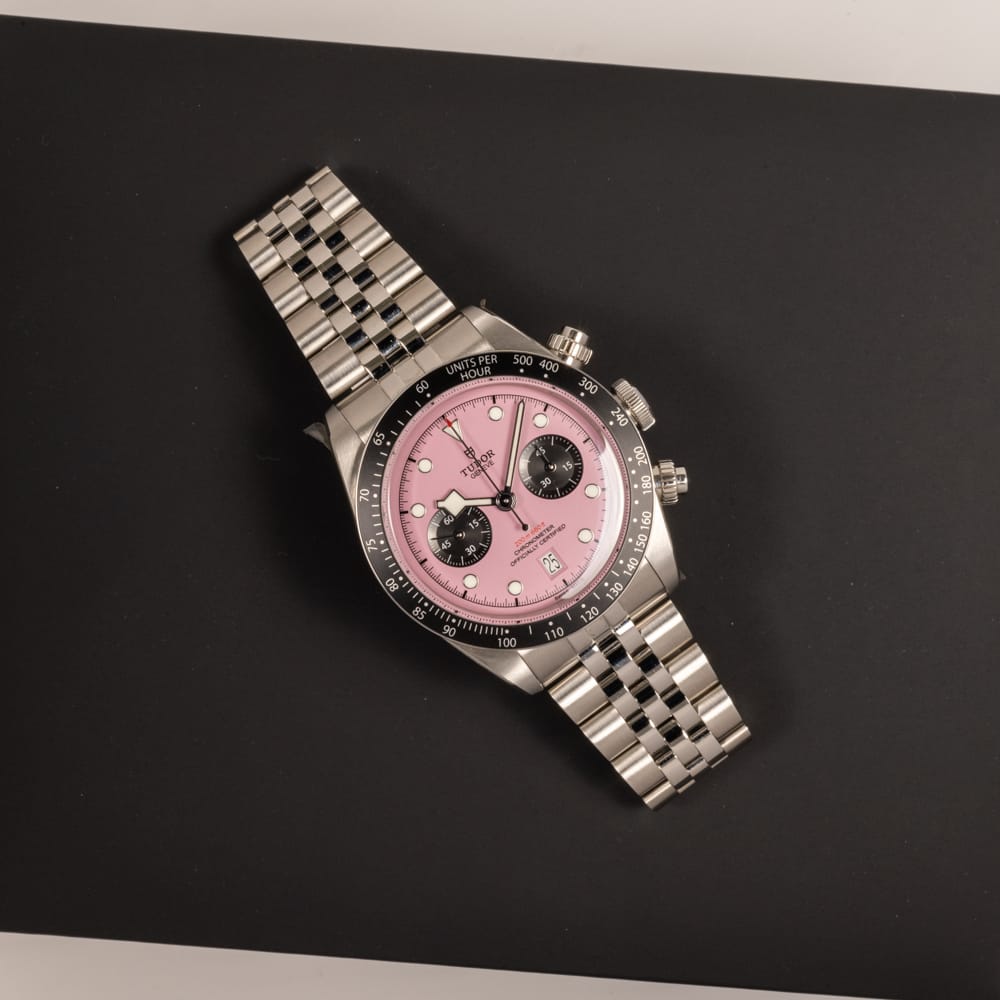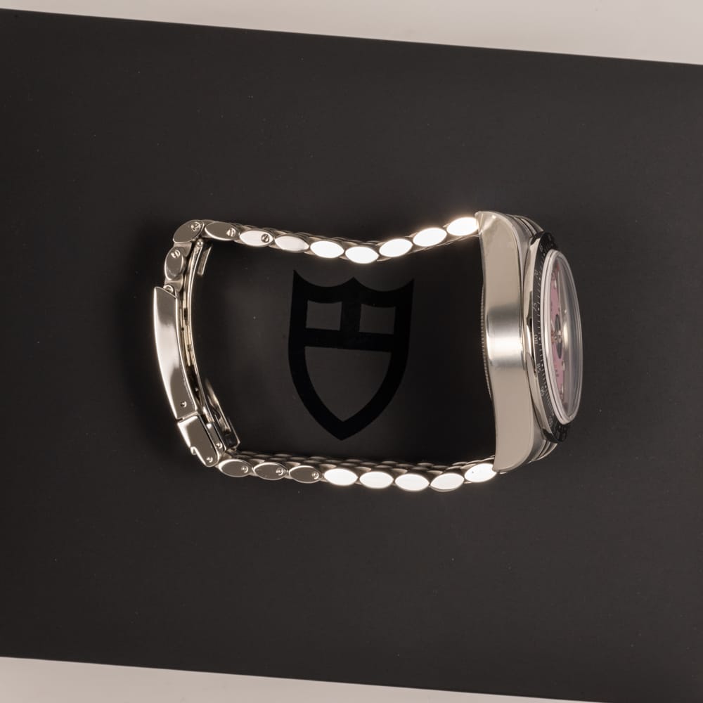 Striking pink dial chronograph with COSC-certified MT5813 movement, 70-hour power reserve, 200 m water resistance and refined steel bracelet — bold heritage motorsport style.