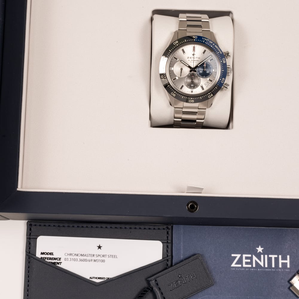 Chronomaster Sport 03.3103.3600/69.M3100 with tricolour ceramic bezel, high-beat El Primero 3600 automatic chronograph and 60-hour reserve — modern 1/10th second precision in a versatile 41mm steel case.