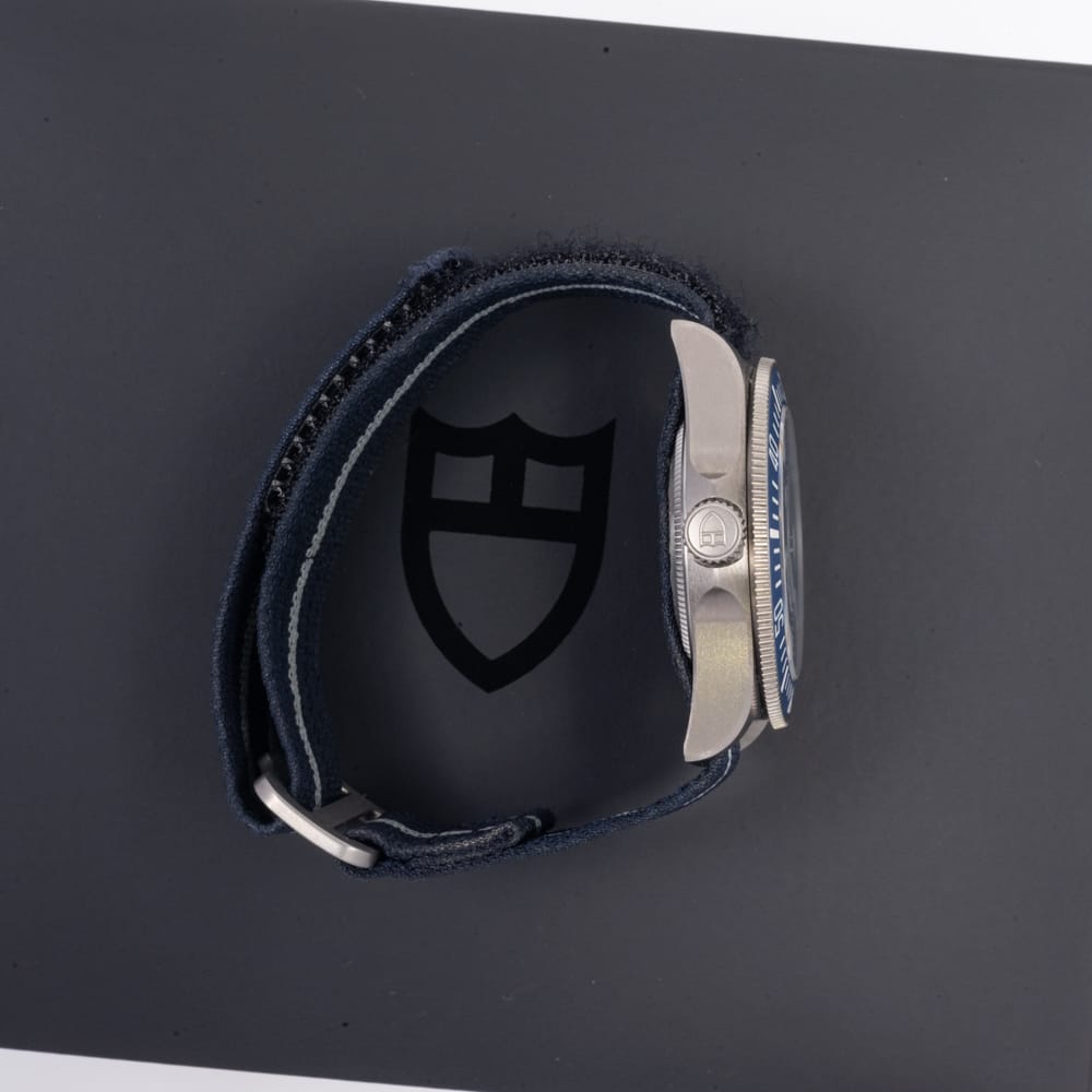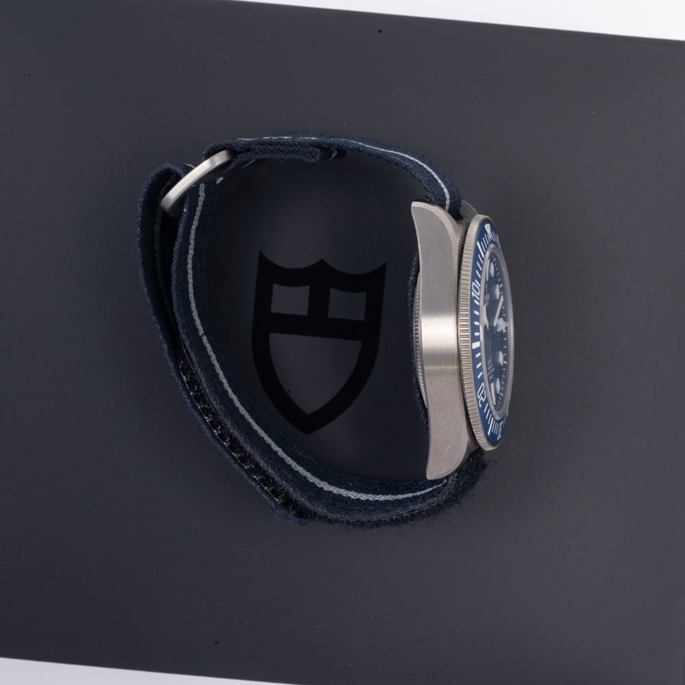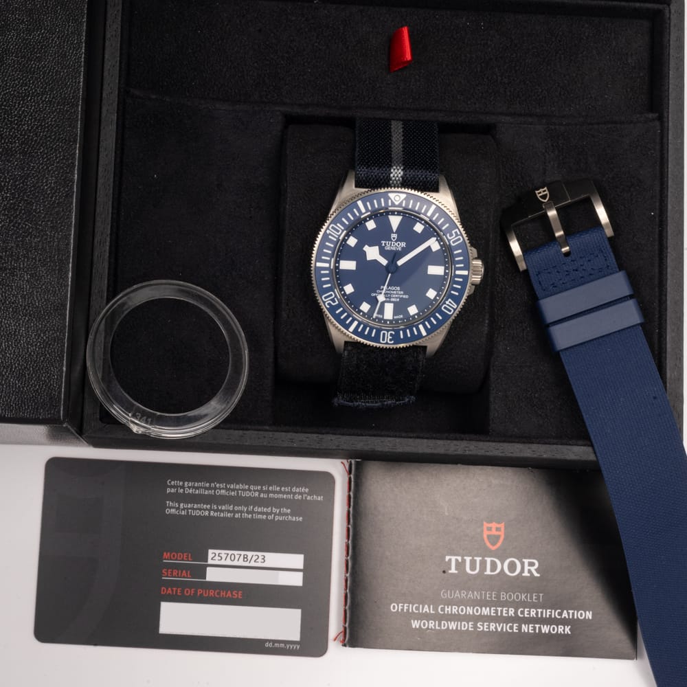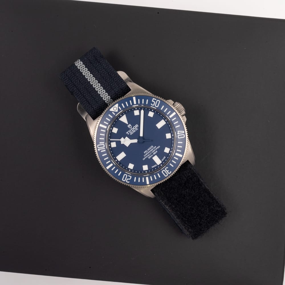 A purpose-built Tudor FXD Pelagos with fixed strap bars, blue dial, and lightweight titanium case developed for naval use.