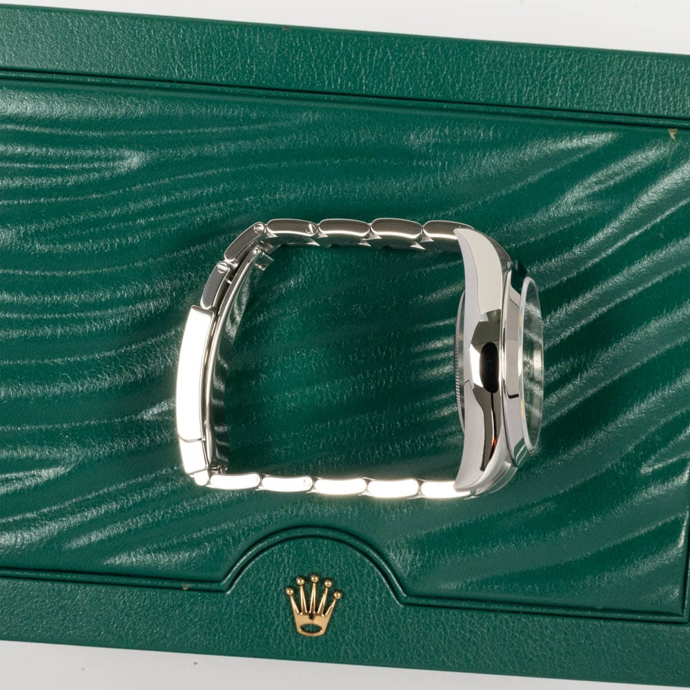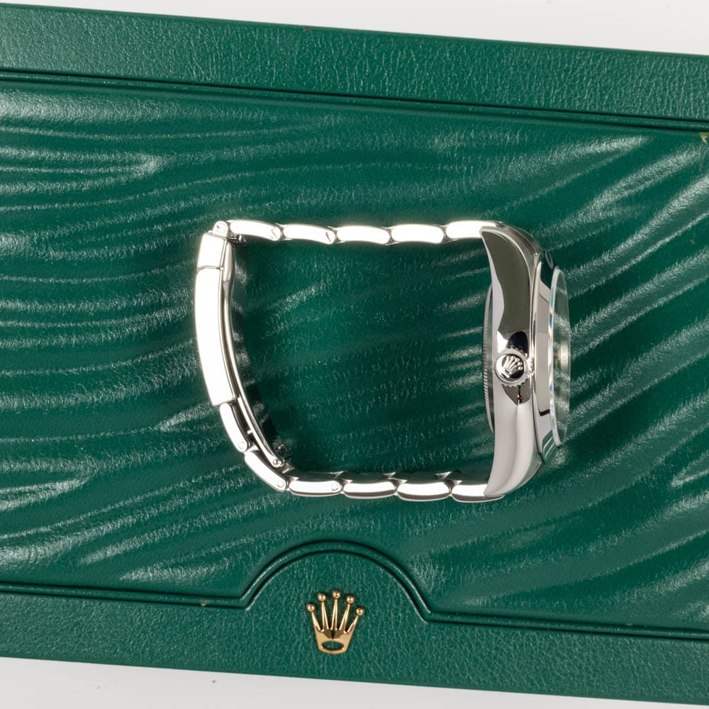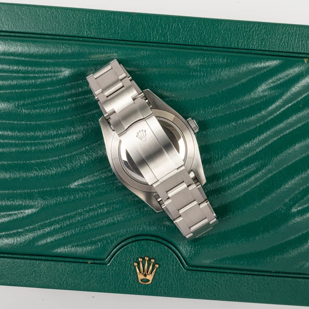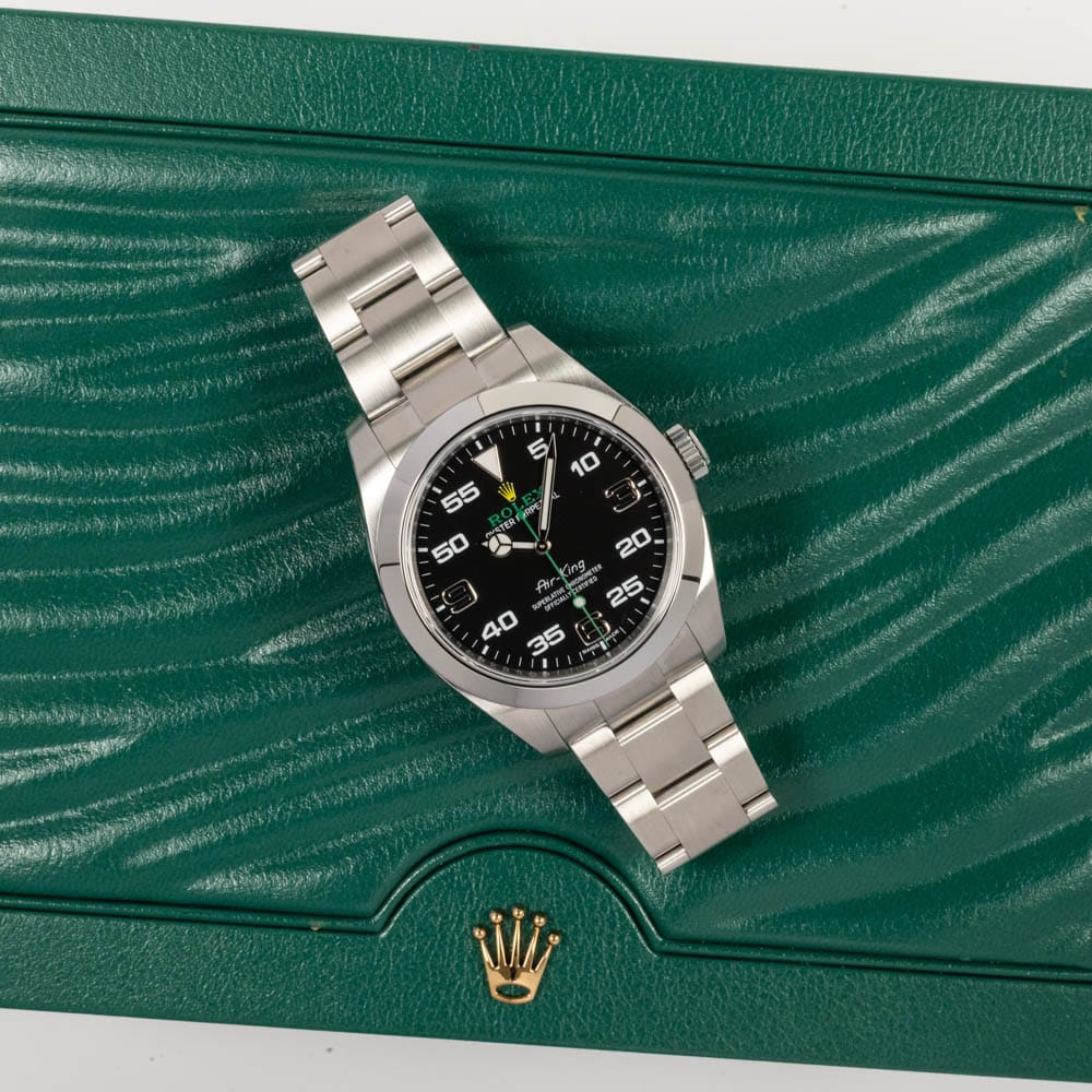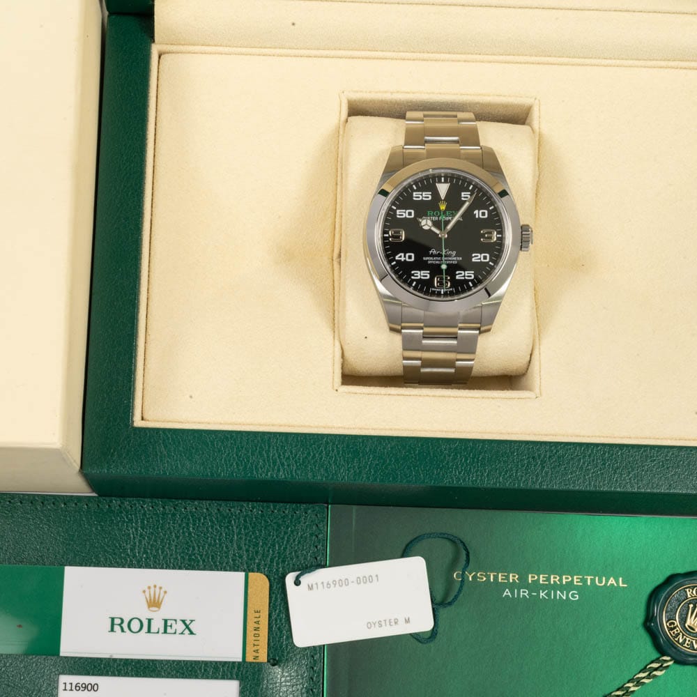 The Rolex Air-King combines aviation heritage with modern precision, featuring a bold black dial, signature green accents, and the robust Oystersteel case for timeless adventure.