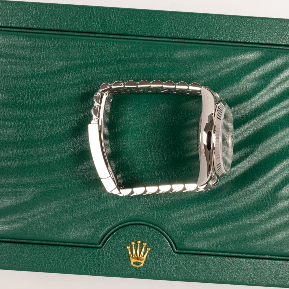 Datejust 36 126234 “Wimbledon” on Jubilee blends its distinctive slate and green dial with White Rolesor construction and the advanced calibre 3235 movement.