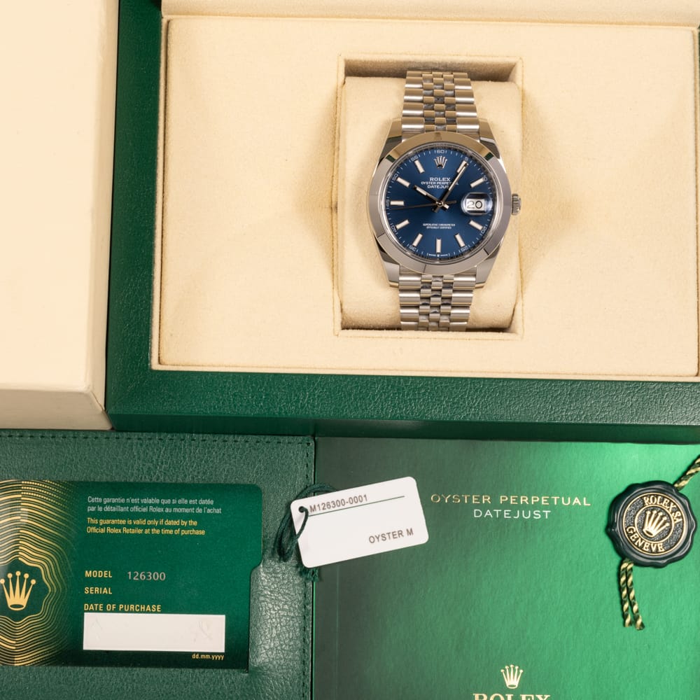 Datejust 41 126300 with sunburst blue dial and Jubilee bracelet, powered by Calibre 3235 automatic movement with 70-hour reserve — versatile stainless steel classic combining everyday refinement with modern Rolex performance
