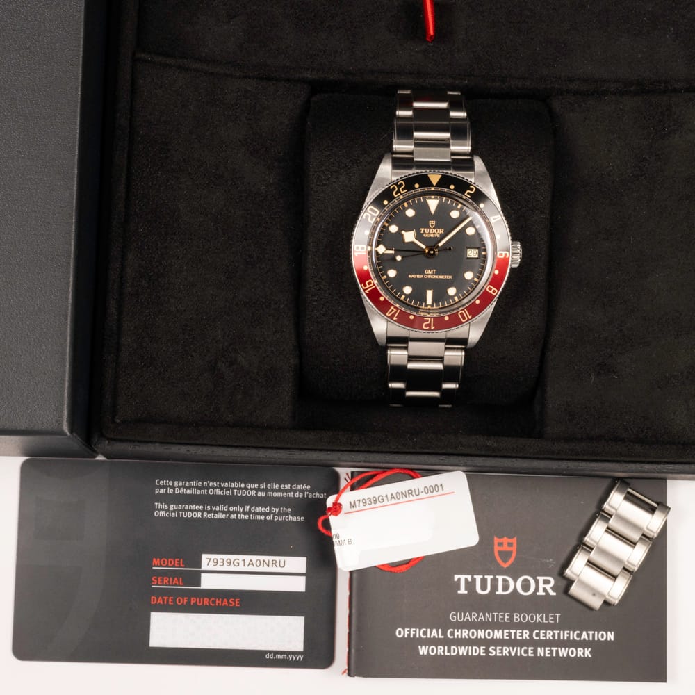 Tudor Black Bay GMT 7939G1A0NRU with black dial, stainless steel case and black and red “Coke” bezel, powered by calibre MT5652 automatic movement, featuring dual time zone functionality and robust tool watch design.
